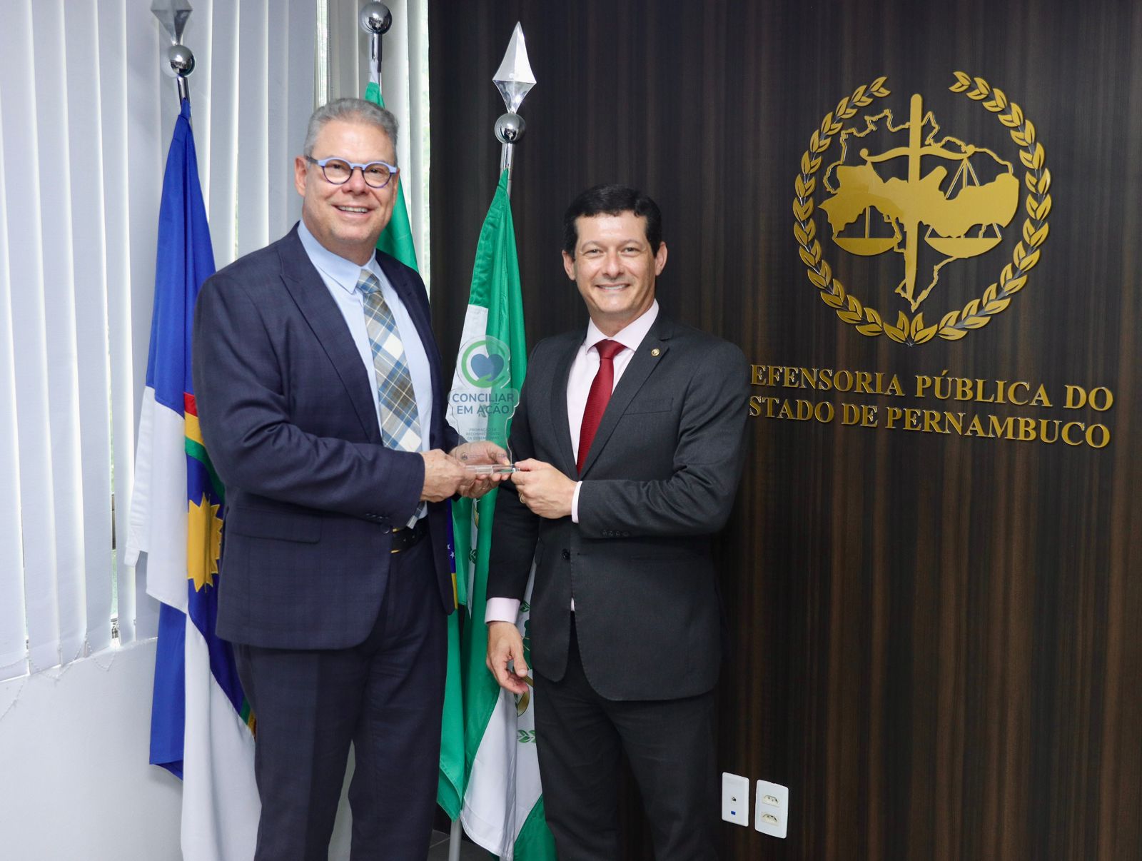 Continue LendoNesta quarta-feira (28), a Defensoria Pública recebeu das mãos do Coordenador-geral do Núcleo Permanente de Métodos Consensuais de Solução de Conflitos (NUPEMEC desembargador, Érik Simões, o trófeu de